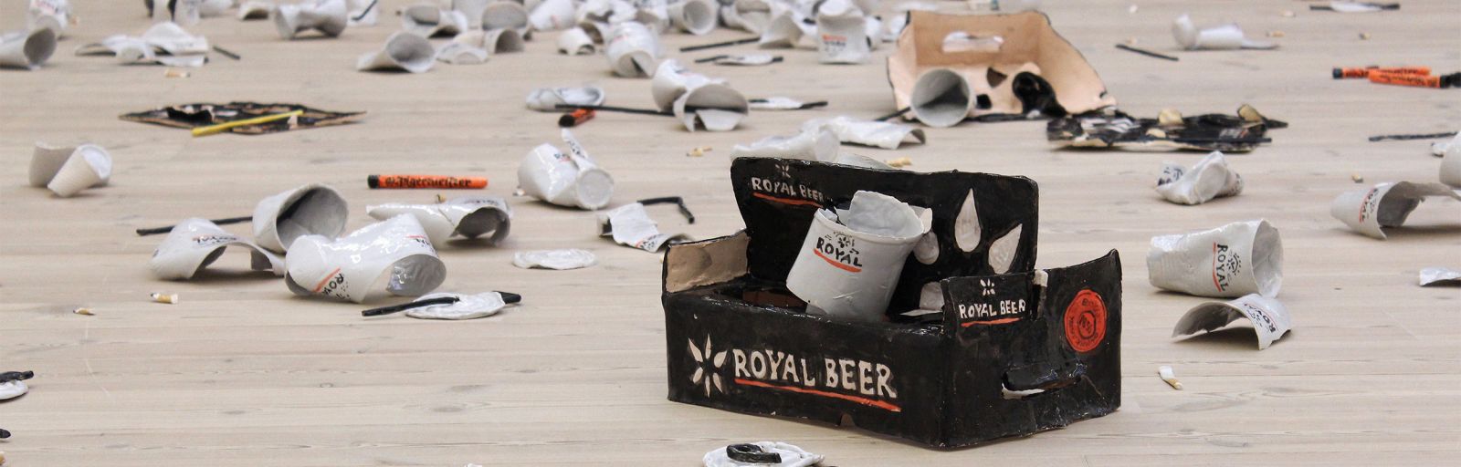 Rose Eken har igennem sit arbejde som scenetekniker altid tilbragt meget tid backstage til koncerter. Og det har sat sine spor i den nu 42-årige kunstner. “Der er noget utroligt empowering ved at stå på en scene som musiker. Samtidig er der noget fragilt over det – man kan lave fejl, det hele kan falde fra hinanden,” fortæller Rose Eken. Sådanne overvejelser har haft en stor indflydelse på hendes valg af materialer. Ligesom alting på en scene kan ramle sammen, så kan keramik gå i stykker – helt bogstaveligt. For Rose Eken ligger der hele tiden en dialog i det med at tingene kan gå itu, når hun arbejder.Vi står nu inde i museets store udstillingssal, som forestiller et mennesketomt rum, fastfrosset i tid og sted. Det er øjeblikket efter en koncert er slut. Musikerne har forladt scenen og publikum er taget hjem. Tilbage overalt på gulvet ligger nedtrampede øldåser, plastikkrus og cigaretskodder – alt sammen lavet i keramik. Ser man nærmere på de mange genstande, kan man se, at de alle sammen er lidt for små. Rose Eken har nemlig manipuleret med objekternes skala og proportioner. “Det hele bliver mere levende, og det kommer til at handle om essensen af tingene,” fortæller hun.